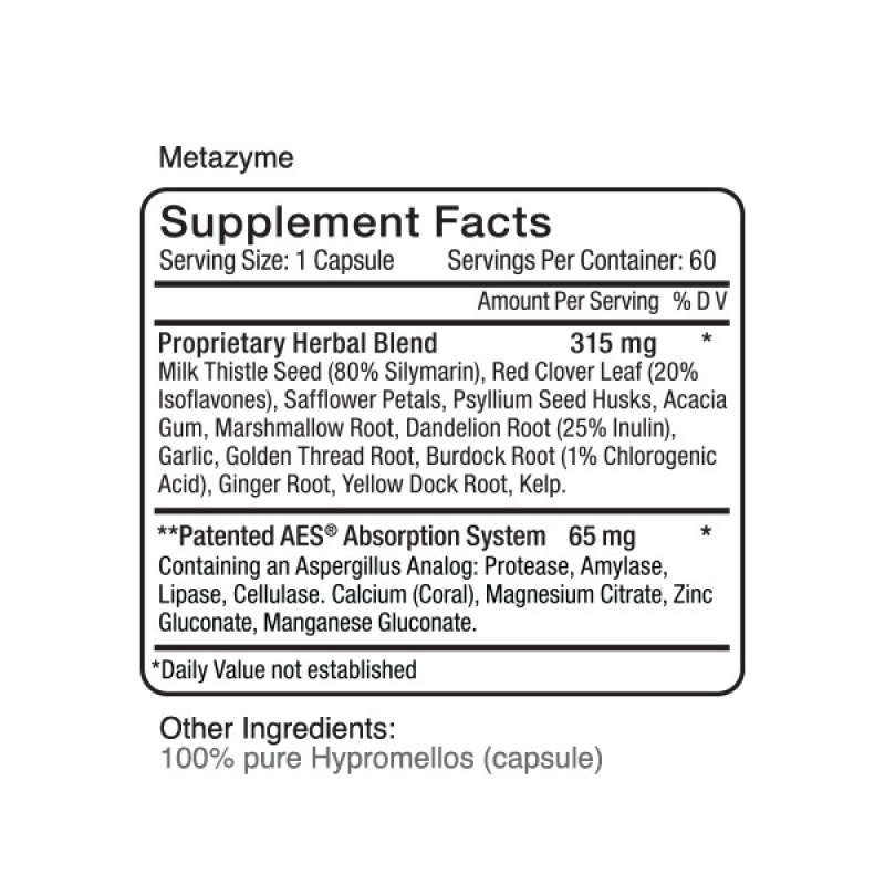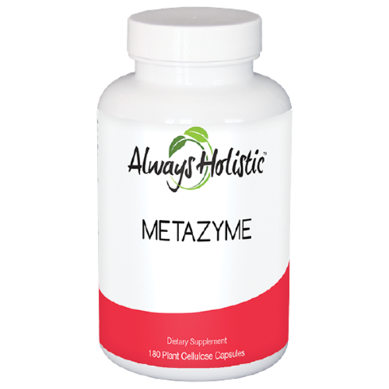 This digestive enzyme is specifically designed to aid in the digestion of all foods including proteins, carbohydrates, starches, fats, fibers and all forms of sugars. Everyone’s ultimate goal should be to get the foods they eat broken down into their smallest components for absorption of vitamins, minerals, and other nutrients. This formula of seven enzymes contains more than seventy-seven organic minerals and some selected macro minerals to act as co-factors to “trigger” the enzymes into action. Four of the enzymes specifically aid in the processing of sugars to maintain proper glucose and insulin levels. This enzyme formula is derived from organic Aspergillus and is effective at all pH levels and body temperatures, unlike bromalain, papain, and pancreatic enzymes. One to two capsules should be taken at the beginning of all cooked meals. To use Metazyme as a SYSTEMIC ENZYME use one to two capsules between meals as well.